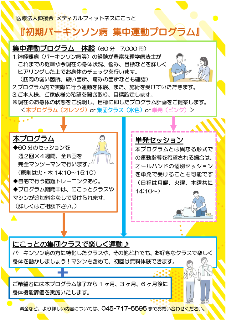 週2回の頻度で1カ月間、とにかく集中的にトレーニングすることで心身機能面の改善を目指します。パーキンソン病は早い段階での集中的リハビリがとにかく重要。悩んでいる方は、メディカルフィットネスにこっと(045-717-5595)まで是非お気軽にご相談ください。
